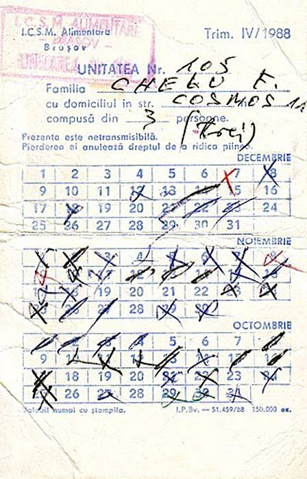 Deci noi, cei 55 de abonați ai blogului Valea Jiului necontondentă adunam într-o zi, bine, dacă formam într-adevăr o comunitate, 220 grame de făină, 440 grame de orez, 1815 grame de zahăr, 1,1 litri de ulei, 3,3 kg de cartofi și 2,75 kg de făină de mălai. La șase zile aveam și 55 de ouă. Un adevărat festin se putea face din toate astea. Și zi de zi, zi de zi. Vedeți ce bine era înainte de 1989? Totul era să fim uniți și am fi dus-o bine, din ce în ce mai bine. Alimentația rațională era bună. Ce banane și blugi?