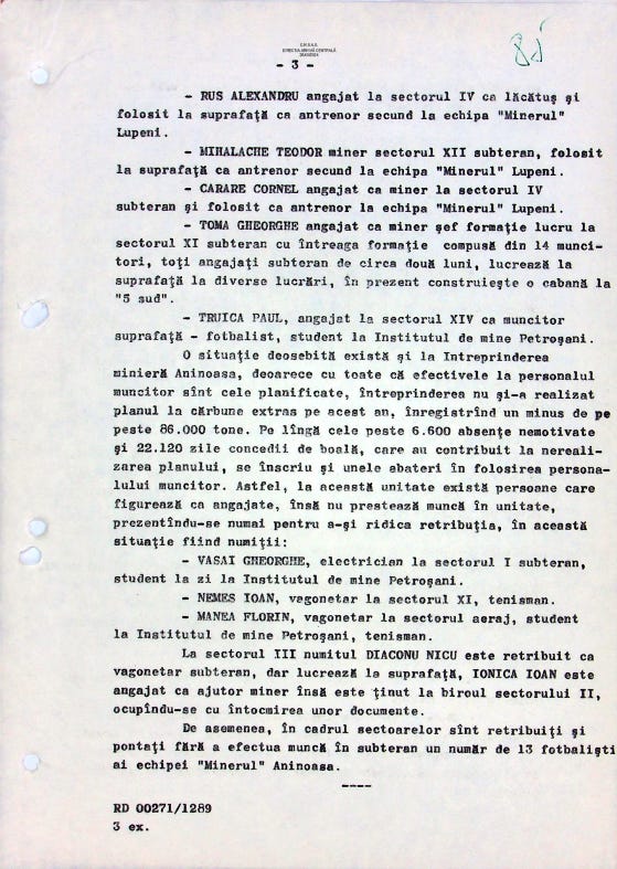 Deci asta ar fi cu pontajele fictive ale sportivilor. Se știa despre ele la cel mai înalt nivel, totul era însă transmis prin ordine verbale, pe cale ierarhică, de sus în jos, până la cel ce făcea pontajul. Ultima rotiță. Desigur că au apărut și profitori, de pe urma situației. Un caz e cel al celui/ celor care le dijmuiau acestora salariile. Alte cazuri le vedeți într-un document din 1981, pe care îl prezint mai jos. Dacă au existat atunci, de ce să nu fi existat și ulterior.