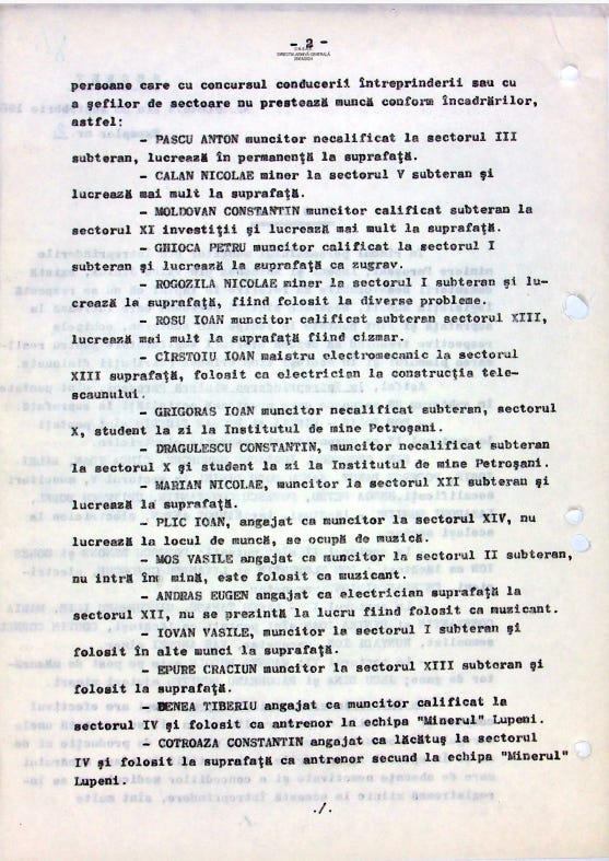 Documentul este destul de elocvent în ceea ce privește categoriile de oameni pontați pentru ca minerul să poată să își petreacă timpul liber într-un mod plăcut. Nu? Avem cei 14 lucrători subteran care lucrau la construcția cabanei ”5 Sud” – cabană a minei Lupeni, muzicanți, sportivi, electricianul care lucra la construcția telescaunului de la Straja (dar despre asta mă gândesc să scriu alt articol). În plus, după cum puteți citi există o categorie aparte care este pontată subteran, dar în majoritatea timpului lucrază la suprafață, la mină. Aici intră tot felul de meseriași care reparau utilaje sau echipamente mai complexe, magazioneri, care de asemenea reparau și pregăteau scule și materiale pentru cei din subteran, strungari, electricieni și probabil, o mică parte pile din acele care nu vor sau nu știu să facă nimic. Nu știu cum era în 1981 în ceea ce privește salarizarea și numărul meseriașior de suprafață, dar în perioada în care am lucrat eu, salarizarea era nesatisfăcătoare, motiv pentru care aproape toți preferau să intre în subteran, știind că din cauza numărului insuficient al celor de la suprafață, de la atelierul mecanic sau electric, șefii erau forțați să îi folosească pe ei pentru a rezolva rapid și eficient problemele. Era un cerc vicios. Aveai nevoie de ei pentru a fi sigur că dai la timp în mină echipamente și utilaje scoase la reparat. Deci aceștia erau doar pe jumătate pontați fictiv, pentru că lucrau la mină, uneori poate chiar mai mult decât cei din mină, dar la suprafață. Și de obicei aveau grijă șefii lor să nu uite nici mina!