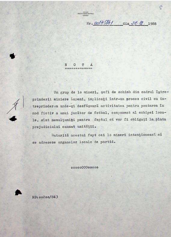 Cel de-al doilea document este mai scurt și prezintă consecințele nedorite ale descoperirii pontajelor fictive. Numai că vinovații ar fi trebuit căutați în altă parte. De aici probabil și amenințările celor incriminați. Nu știm cum s-a terminat daravela, dar sper că nu au plătit ei prejudiciul. Documentul e din 1989, vorbește despre un fotbalist, ceea ce arată că practica clanului sportivilor s-a perpetuat în timp. De altfel, așa s-a intamplat și după 1989, în același tandem, administrație, sindicate. Îl aveți mai jos. Nu tandemul, acela cu suișuri și coborâșuri s-a menținut până azi. Documentul.