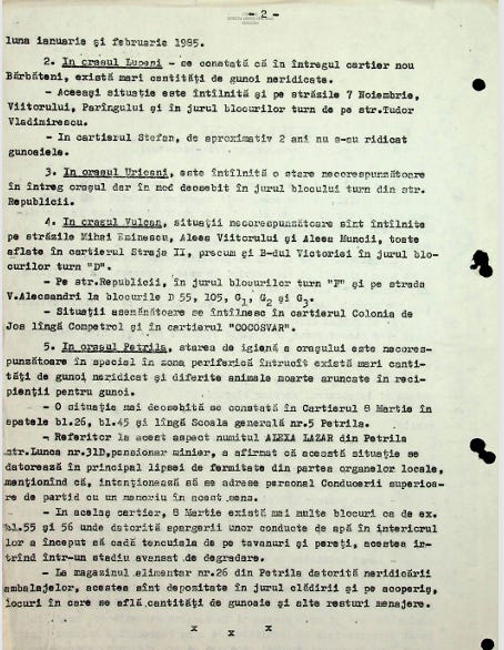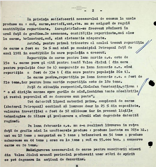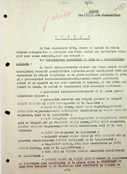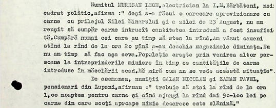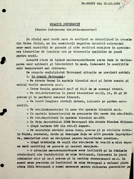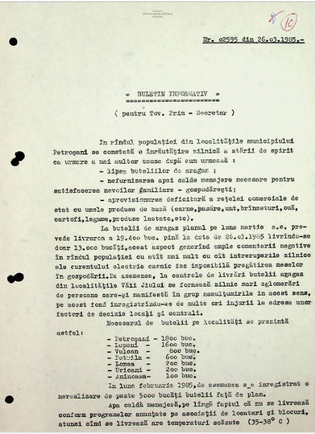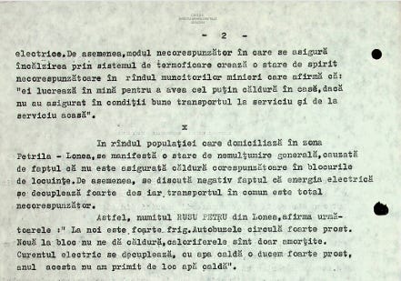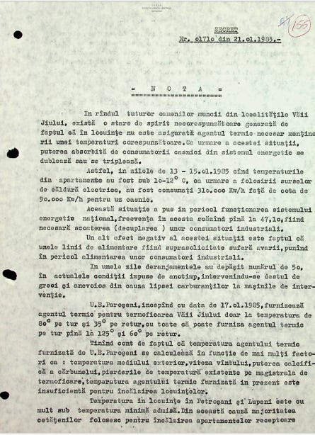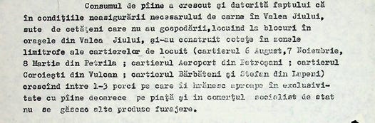 Municipiul Petroșani cuprindea atunci toate orașele Văii Jiului. Administrația era deci un pic mai centralizată. Existau însă și pe atunci primării orășenești și Consilii ale oamenilor muncii în fiecare oraș și chiar la fiecare întreprindere. Problemele ce rezultă din această notă se văd clar: lipsa buteliilor de aragaz (rețeaua de gaz metan s-a extins doar după 1989, foarte lent), aprovizionare deficitară la produse alimentare de bază, lipsa apei calde menajere (iar atunci când totuși se furniza, temperatura foarte scăzută a acesteia). Continuăm?