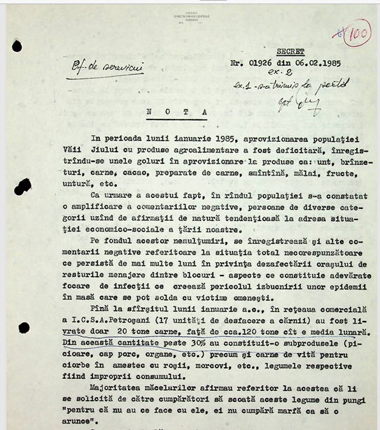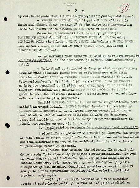 Ăsta e un buletin informativ din octombrie 1985. Abordează după cum ați putut citi, mai multe nemulțumiri din rândul populației și chiar comentariile unor nemulțumiți. Securitatea era ochiul și timpanul Partidului Comunist. Tot ceea ce mișca era observat și raportat. Vizavi de comentariile populației, vă recomand un articol scurt de pe la începuturile blogului. Un demn urmaș al regretatului I.D.Sârbu, petrilean deci conorășean cu acesta, este savuros prin felul cum expune probabil într-o scrisoare deschisă de Securitate, cu ce lipsuri se confruntă în aprovizionare. Vi-l las aici, numai să dați clik pe titlu. E drept, e din 1989. Dar e încă o dovadă că din 1985 până în 1989 lucrurile nu au mers înspre bine, ci din contră.